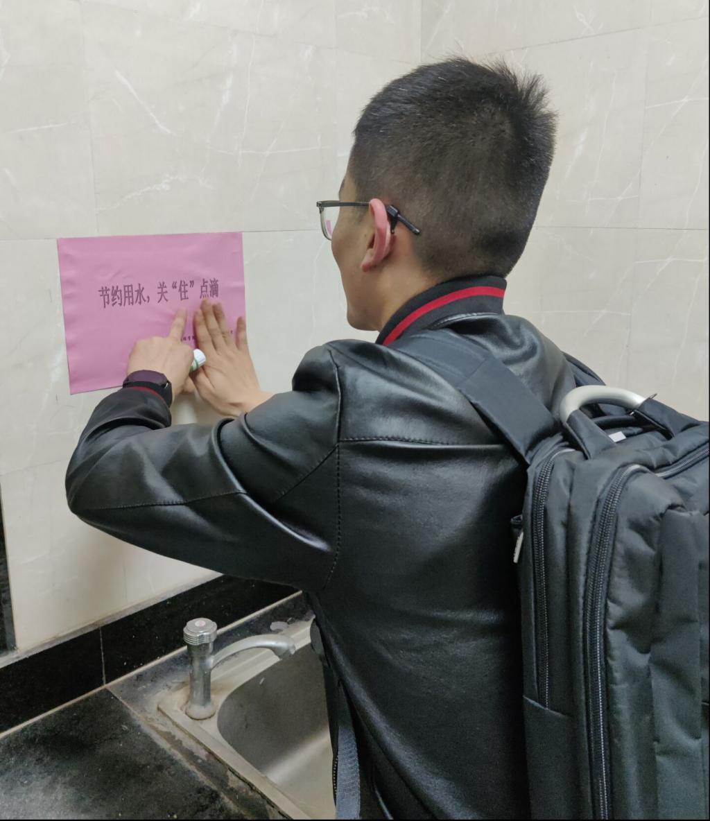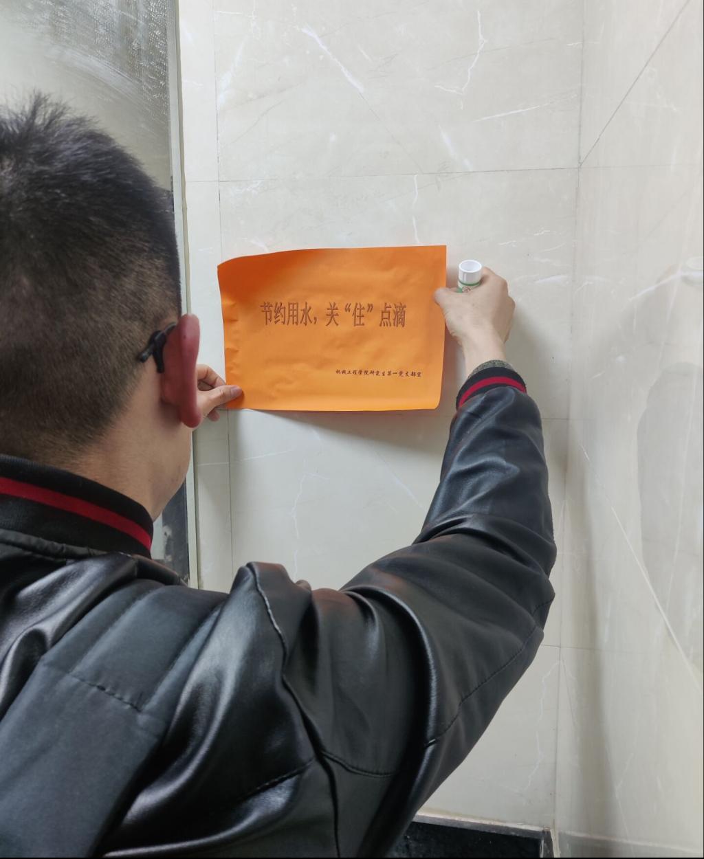 线下,研究生党员代表分别在机械楼的茶水间、卫生间的醒目位置张贴了精心制作的节约用水宣传标语。(撰稿:张敏  审核:李克明)