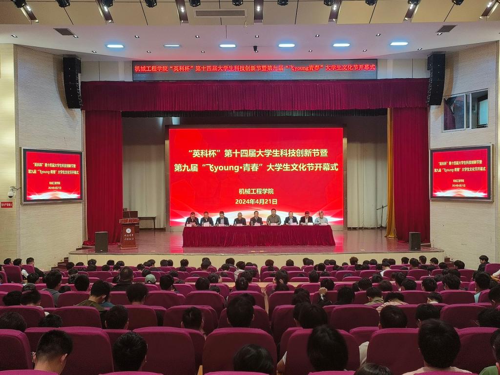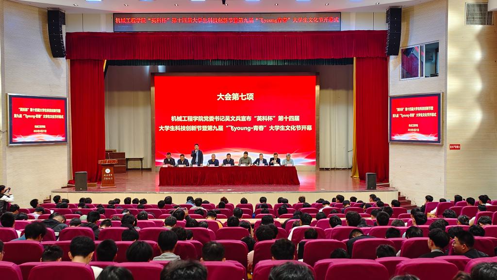 4月21日下午,色情直播 “英科杯”第十四届大学生科技创新节暨第九届“飞young·青春”大学生文化节在秀山校区大学生活动中心隆重开幕,校学工部、教务处、创新创业学院负责人、学院领导班子和企业代表出席开幕式,学院各系主任、全体辅导员、各年级学生代表400余人参加开幕式。