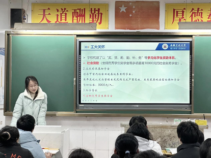 “学生资助宣传大使”返回家乡,深入中学,利用寒假赴高中现身说法,开展“资助政策下乡”行动。她们结合自身经历,向学弟学妹及家长详细介绍学校奖、助、贷、补、勤、免等资助体系,分享大学生活感悟与学习经验,鼓励家庭经济困难学生树立信心、积极报考,为高校与生源地搭建起政策传递的暖心纽带。