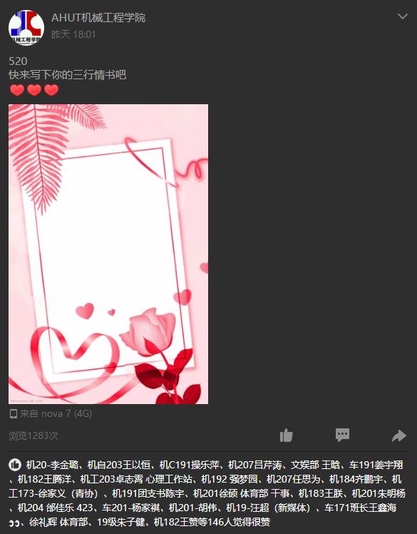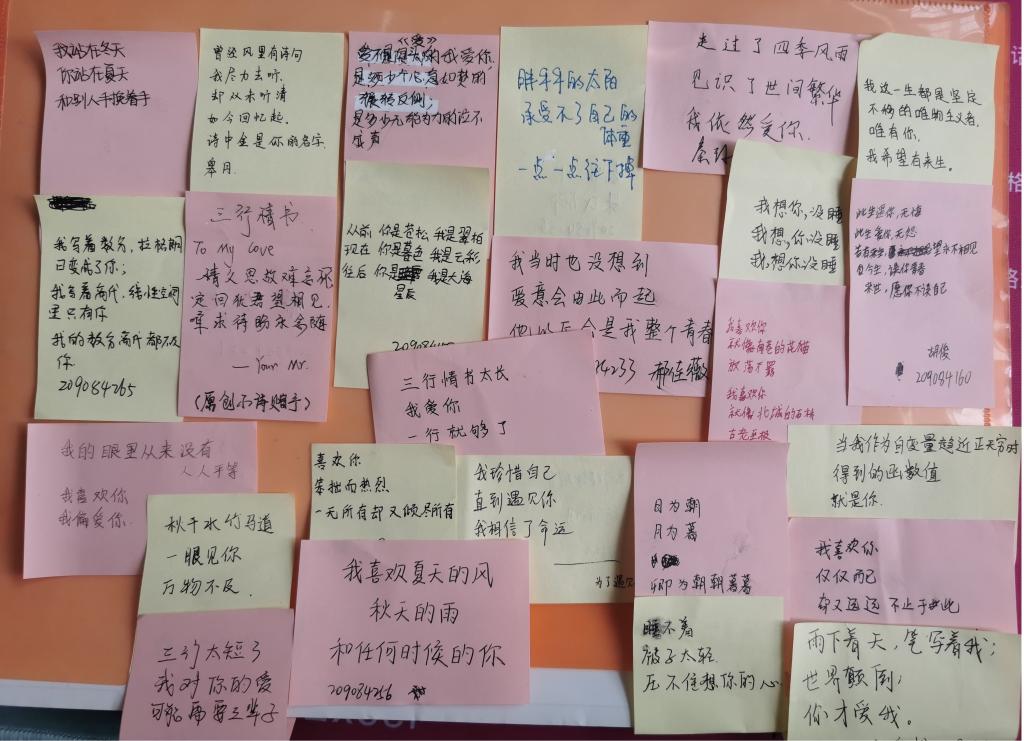 5月20日寓意“我爱你”,在这个甜蜜的日子里,为了让更多的同学可以表达自己对亲人、爱人、朋友、社会的爱,增加同学之间的感情,培养大学生良好的品质,色情直播 组织了“三行情书活动”。