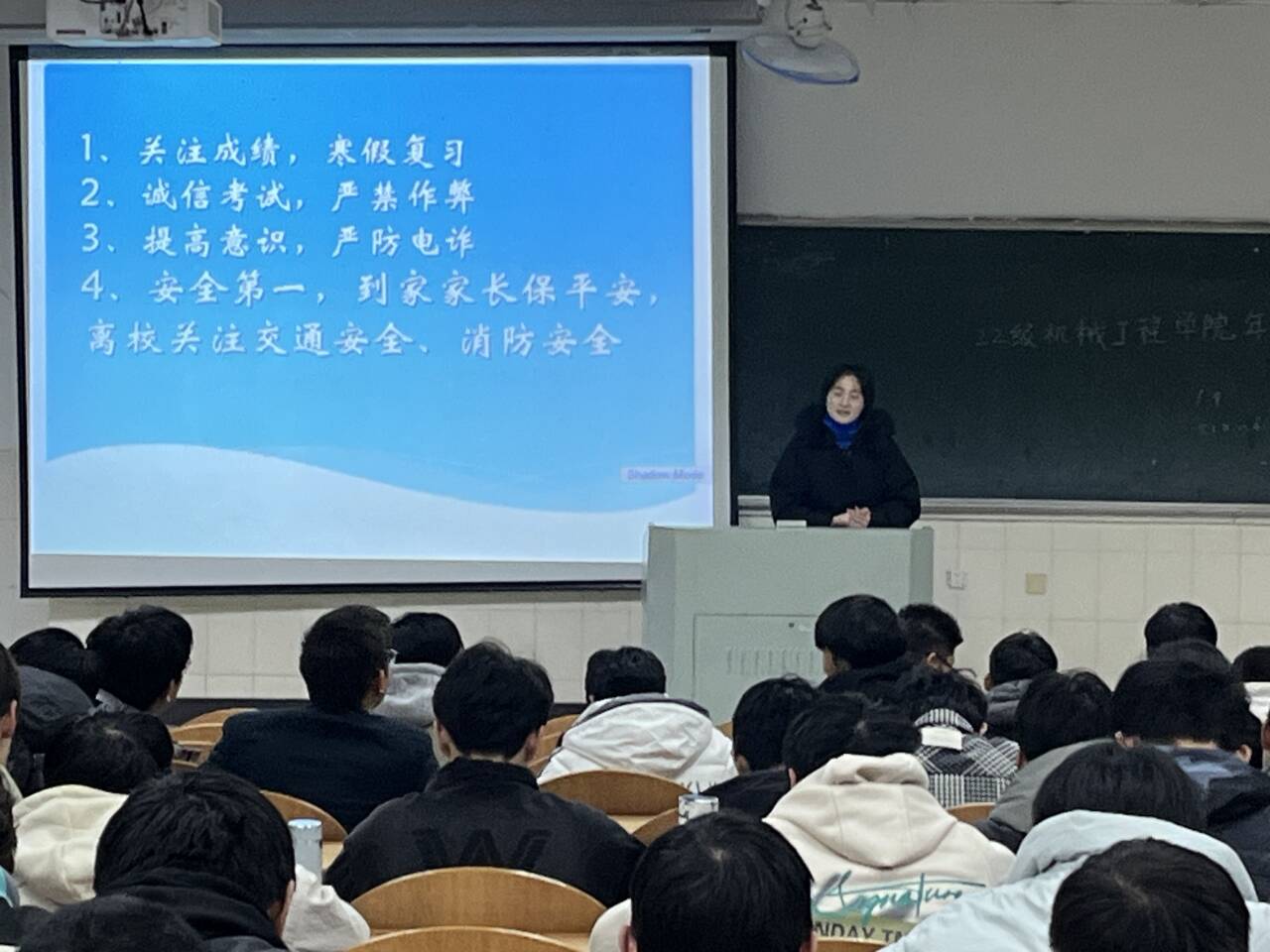 会上,2位老师从交通安全、宿舍消防安全、防电信诈骗等方面进行了假期安全教育,指出离校前应寝室应断电、锁门、贴封条,路途中妥善保管个人贵重物品、注意安全,到家后要及时告知老师报平安。之后,濮莹萍再次就考风考纪进行了进一步的强调,希望同学们能够继续端正学习态度,认真备考,严格遵守考场纪律,诚信对待最后一门考试,共同营造风清气正的考风学风。最后,费白露提出,希望同学们合理规划假期生活,对于在期末考试中挂科的同学,应把握假期充裕的时间,认真复习,为开学补考做足准备。(撰稿:费白露 审核:濮莹萍 周环 陈庆林)