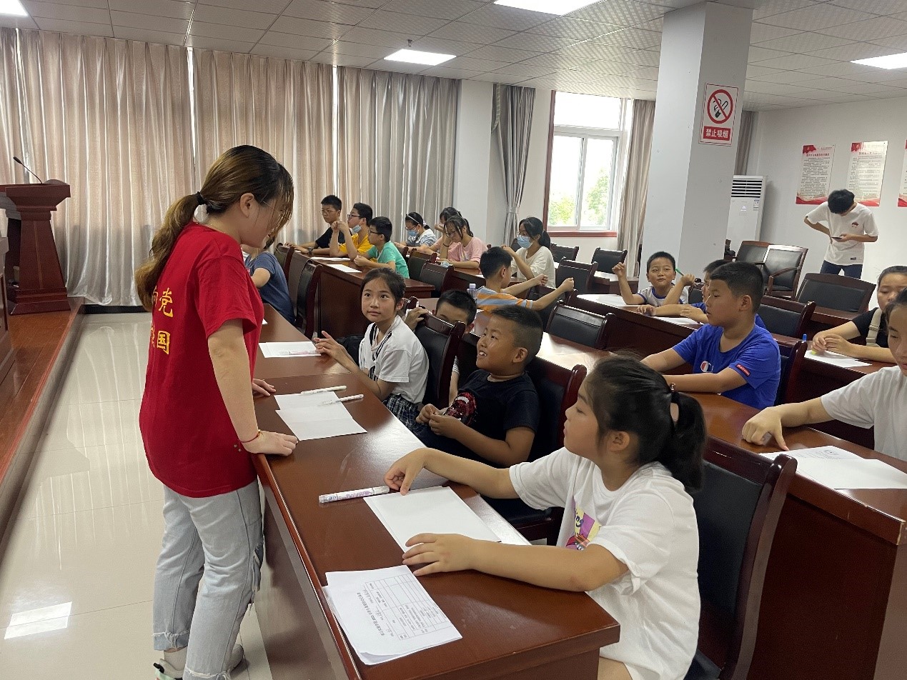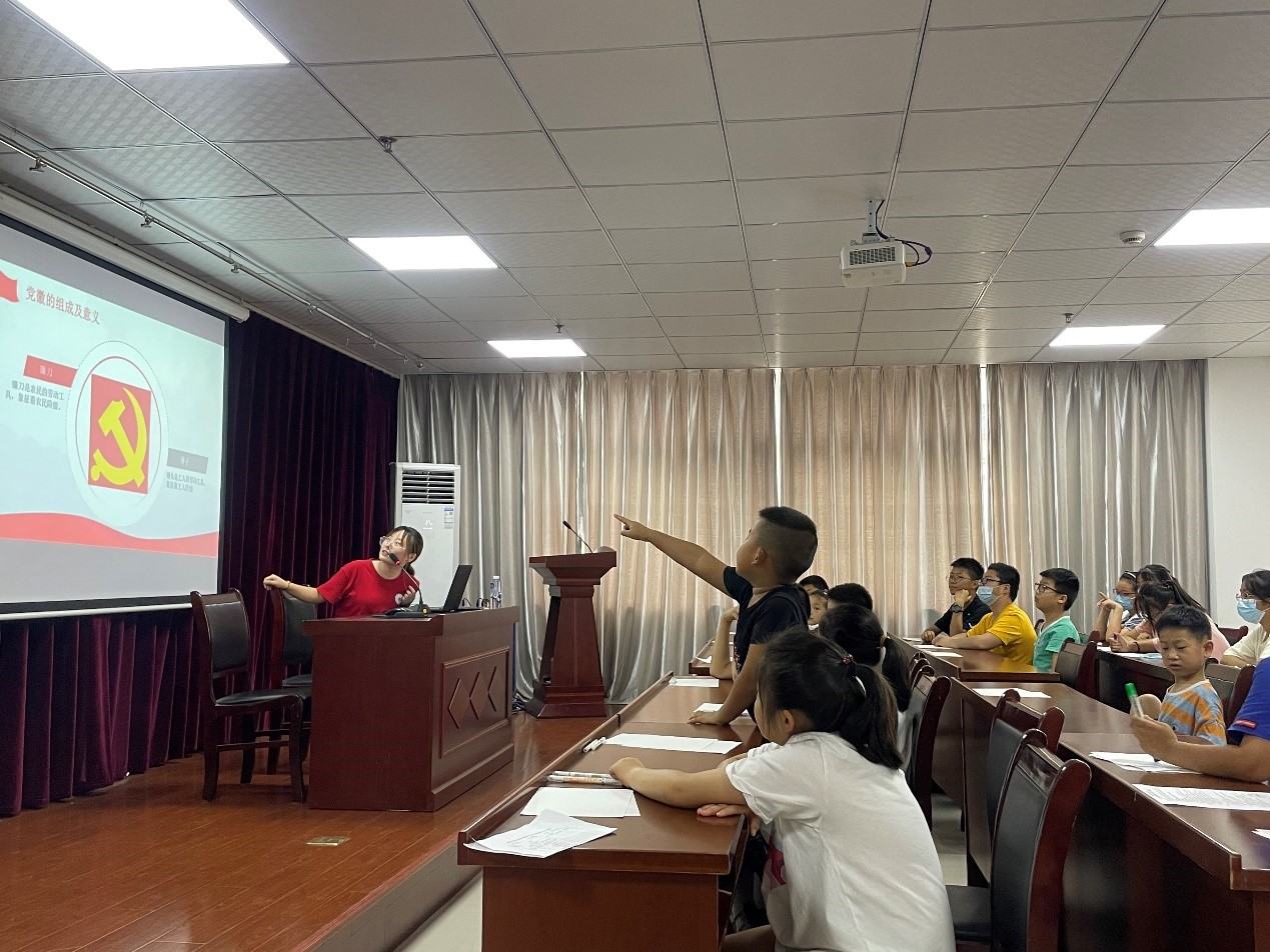 活动中,主讲人向社区小朋友们介绍了党徽的构成分别蕴含着什么含义,讲述了中国年龄最小的革命烈士宋振中的故事,勉励小朋友们从小爱党、爱国、爱社会主义。之后,在实践队员帮助下,小朋友们在卡纸上画下了心中的天安门,党旗,用自己的小手画下属于自己的红色印迹。