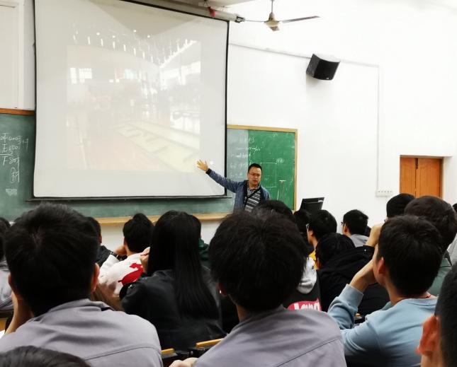 杨琦首先对工程训练大赛的赛程概况以及赛事类型向同学们作了介绍,针对各个赛事的不同之处作出详细的分析与指导,并通过一些比赛的视频,帮助大家熟悉比赛流程和比赛规则。杨琦随后向同学们详细讲解了这类竞赛项目历年的竞赛题,介绍了工程基础赛道中的势能驱动车和热能驱动车,从简单的无碳小车绕桩运动到现在的绕8字赛道,甚至是S型赛道,逐一进行了展示。杨琦在现场用无碳小车绘声绘色地向同学们讲解它的机械构造原理和运动方式,这使得同学们理解起来更加容易。之后,杨琦又依次向同学们介绍了智能+赛道、虚拟仿真赛道等等,他希望同学们可以选择自己感兴趣的一项赛事参加,在平时付出更多的努力,发挥自己的聪明才智,争取在竞赛中获得优异的成绩。