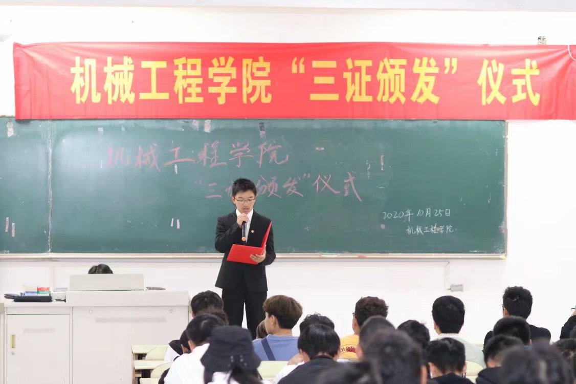 于10月25日中午在教三南103教室举行了2020级新生团员“三证颁发”仪式暨2019—2020学年院优秀“五四红旗团支部”颁奖典礼。出席此次活动的有院团委书记费白露、院团委副书记薛宇、院学生会主席吴超旭及2020级全体新生团员。仪式由院组织部干事黄柳钦主持。