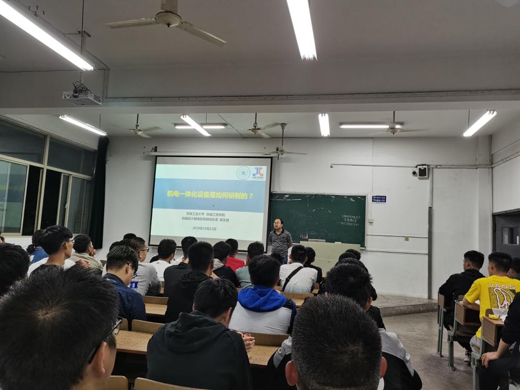 众所周知,学科研究要不断发展,就需要不断与其他领域相融合,谋求创新。机电一体化是由计算机技术、信息技术、机械技术、电子技术、控制技术、光学技术等相融合构成的一门独立的交叉学科。其主要发展方向为智能化,模块化,网络化,微型化,系统化等。会上,高文斌向新生介绍了自己的研究领域,同时结合自己的研究方向向同学们介绍如何研制机电一体化设备,告诉同学们要从大一开始打下扎实的专业基本功,为以后的专业研究做好准备。