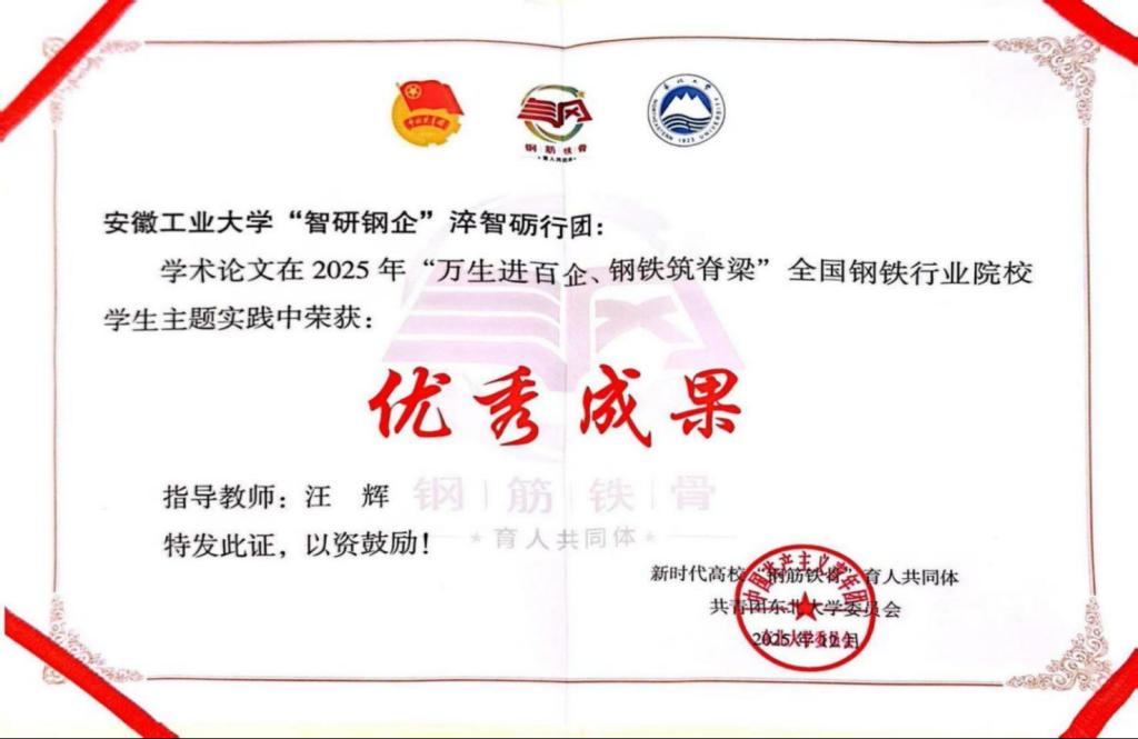 一份荣誉,一份肯定,更是一份使命。此次获奖不仅是对我院实践育人工作的高度认可,更是对青年学子“把论文写在祖国大地上”的殷切期许。未来,我院将继续坚守“扎根钢铁、服务产业”的育人初心,推动更多学子深入企业一线,在钢铁产业高质量发展的浪潮中淬炼真本领、贡献青春力,以青春之我、奋斗之我,为中国钢铁脊梁注入源源不断的青春动能!